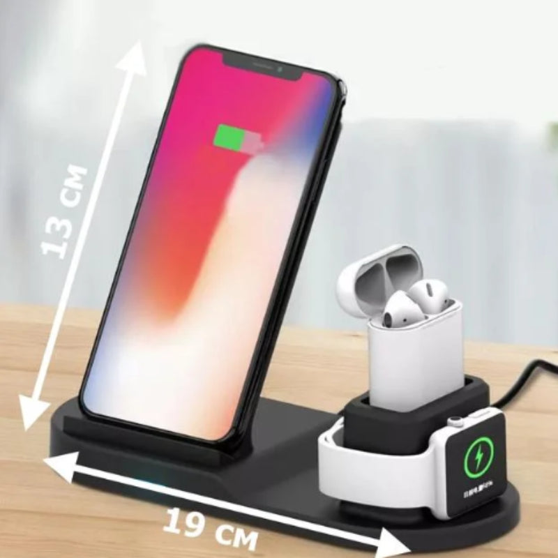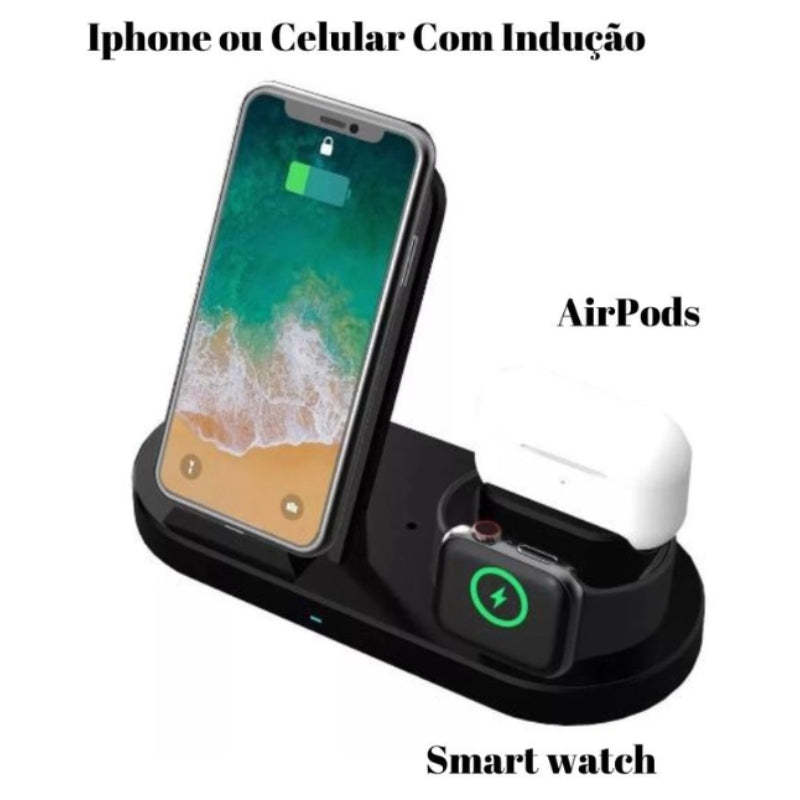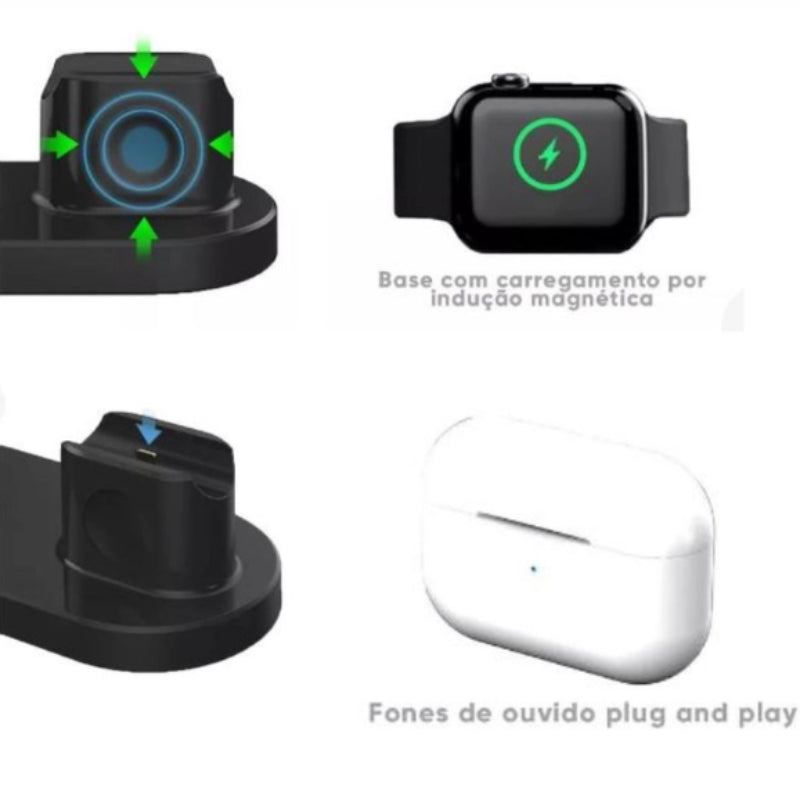 Carregue os seus dispositivos de forma fácil e segura em um único equipamento. A mesa carregadora por indução oferece praticidade e organização na hora de carregar o seu celular, smartwatch e seus fones de ouvido simultaneamente, dispensando o uso de fios e deixando tudo carregado ao mesmo tempo, sem que você corra o risco de ficar sem bateria. Para quem é este produto? Para aqueles que querem a liberdade de não depender de fios! Para quem possui diferentes dispositivos de uso diário e precisa mantê-los sempre carregados (Smartphone, Apple Watch e AirPod). Para quem deseja prolongar a vida útil da bateria do seu Smartphone através de um carregamento por indução de qualidade. Para quem não abre mão do conforto e elegância para recarregar seus dispositivos. Compatibilidade: Smartphones que possuem a tecnologia de carregamento por indução padrão Qi. Apple Watch Series 1, 2, 3, 4 e 5. AirPod, inclusive AirPod Pro. Itens Inclusos: Carregador para Apple Watch embutido Cabo Type-C/USB Adaptador de Carga (Fonte de Alimentação Turbo)