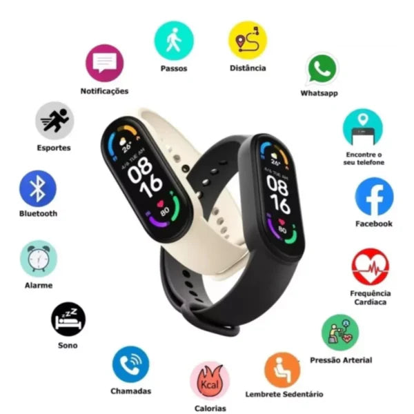 ✔️um smartband compatível com Android 4.4 ou superior e iOS, carregada de recursos para monitorar sua saúde e bem-estar. Controle suas atividades diárias com funções como contador de passos, monitoramento de frequência cardíaca, qualidade do sono, notificações de chamadas e mensagens, além de diversos modos esportivos. Com design leve e confortável, é perfeita para o uso diário.